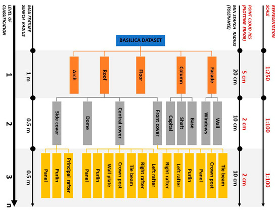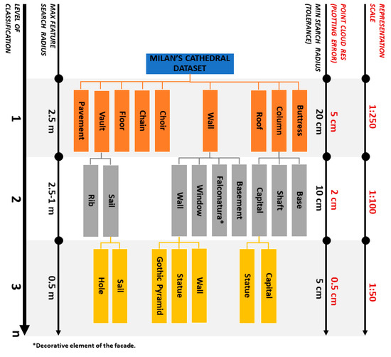 The proposed hierarchical methodology is graphically summarised in Figure 5. The diagram aims also to provide for a general indication in terms of geometric resolution of the point cloud and geometric feature ready to be used at each classification step. These values, and the methodology itself, can be considered sufficiently generalisable to be used for the classification of architectural elements in the monumental field. The parameters (resolution and feature radii) can vary case by case according to the characteristics and dimensions of the objects. However, it can be seen that they correspond to the smallest detail that can be represented at a given representation scale and its metric tolerance, in a logic of representation at an increasing level of detail.