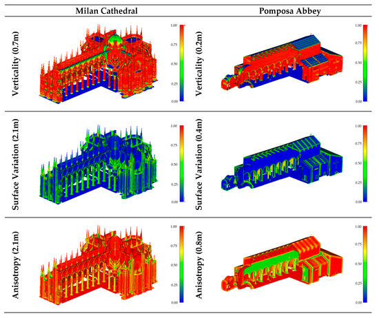 The necessary features for the classification are based on the covariance matrix [57] computed within a local neighbourhood of a 3D point. For both case studies, the considered local neighbourhoods are directly related to the dimension of the architectural elements. Moreover, as various features affect the classification results in different ways, the geometric features with the smallest impact on the training process have been iteratively removed [33]. The experiments showed that, independently from the object to be classified and the point cloud resolution, the features with a more significant impact on the classification results are (Figure 8):
