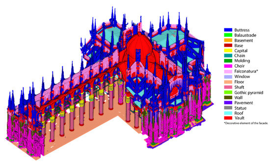Following the Veneranda Fabbrica conservation and restoration rules as well as the hierarchical subdivision of the monument in areas, zones, sectors, architectural elements and marble blocks reported in [56], we consider an automatic classification of the cathedral into three different levels (Figure 6).