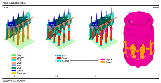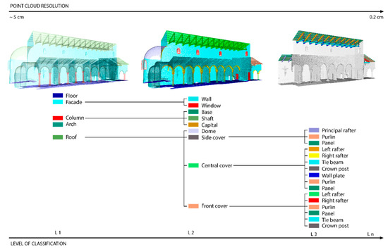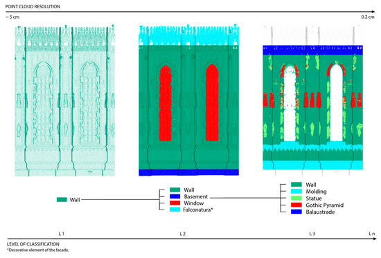 It should be mentioned that each architectural element can be classified in more and more details, according to the employed point cloud resolution at the corresponding level, and then back interpolated on a higher resolution version. The process is iterative, and the last classification level will correspond to the full-resolution point cloud. Moreover, the subsampling of the point cloud will depend on both the complexity of the object to be classified and the elements to be recognised. Macro-categories of objects allow for a lower resolution, while the higher resolution is used for details.