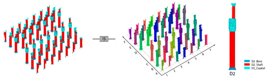 As a final and additional step, after the full classification of the point cloud, it is possible to apply the so-called instance segmentation to each architectural class. In this way, for example, each column of the dataset can have its own index. To do so, the label connected component function available in CloudCompare [55] was used. Still, instead of working on pixels arranged in a grid, the octree structure of the point cloud from which it defines the grid step is used to perform the search in the 3D space. The tool separates the cloud into smaller ones based on a minimum distance between elements and a minimum number of points that a component must have.