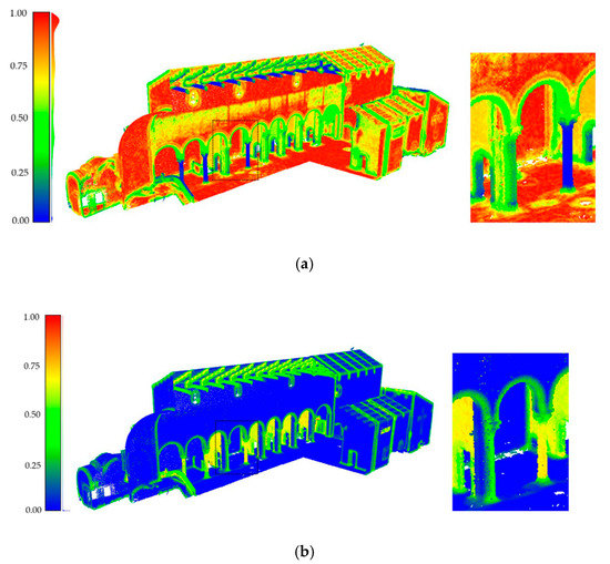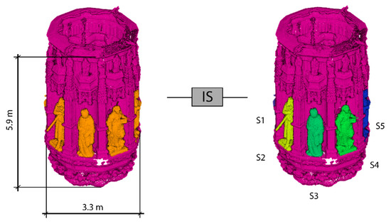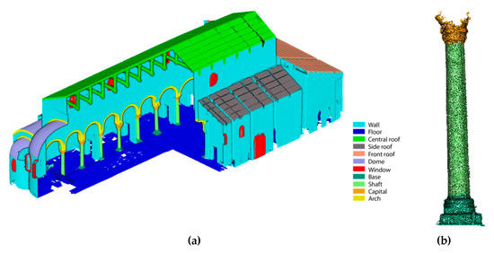 In the architectural heritage field, the process of structuring and classifying 3D survey data have seen various applications such as supporting the scan-to-BIM process [22,23,24,25], monitoring and restoration purposes [3,6,26], maintenance architecture planning [27,28], and damage detection and quantification [29,30,31].