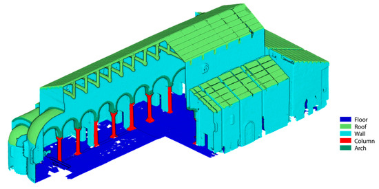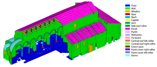 The point cloud classification has considered only the interior datasets of the church (Table 2), which presents several interesting architectural features and a more complex geometric framework compared with the exterior part. The enrichment of the point cloud with semantic information can be useful in particular for the following: