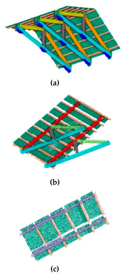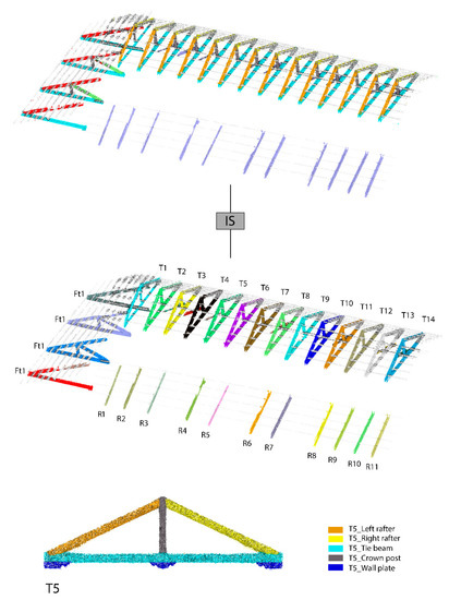 The third level refers to the roof which presents complex and variable structures. A diverse classification process was run for each different roof structure, highlighting its main structural elements (e.g., rafters, purlins, panels, tie beams, wall plates, crown posts, etc.). To finalise this structural study, the suitable resolution of the point cloud was 2 cm.