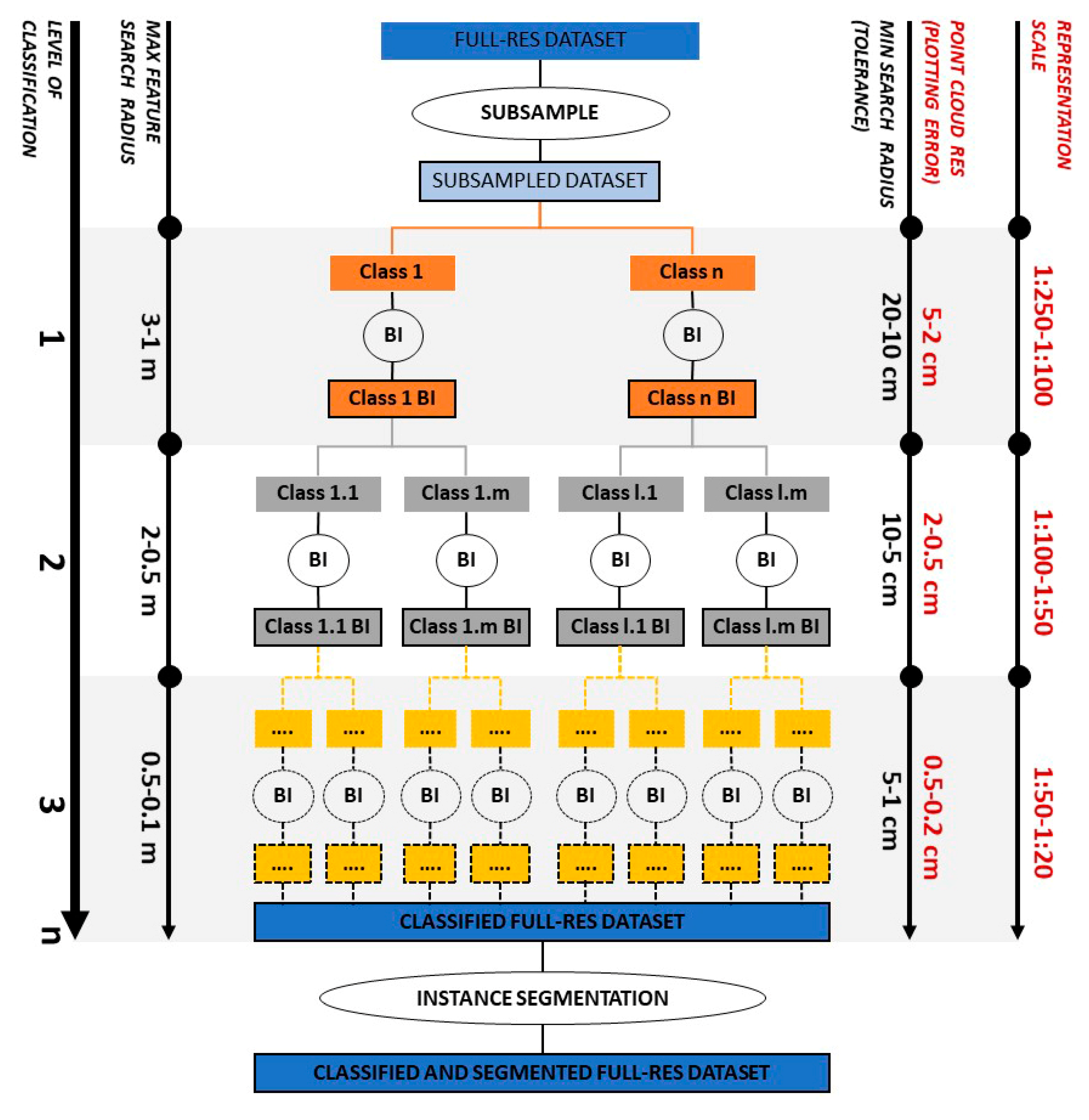 - Classification results coming from this first step are back interpolated (BI) on a higher resolution version of the dataset, using a nearest neighbourhood algorithm. To do so, the class value assigned to each point is transferred to a certain number of elements evaluated inside a specific cluster; the number of nearest neighbourhoods to be evaluated depends on the point cloud resolution. The higher the resolution, the higher the number of points in the neighbourhood.