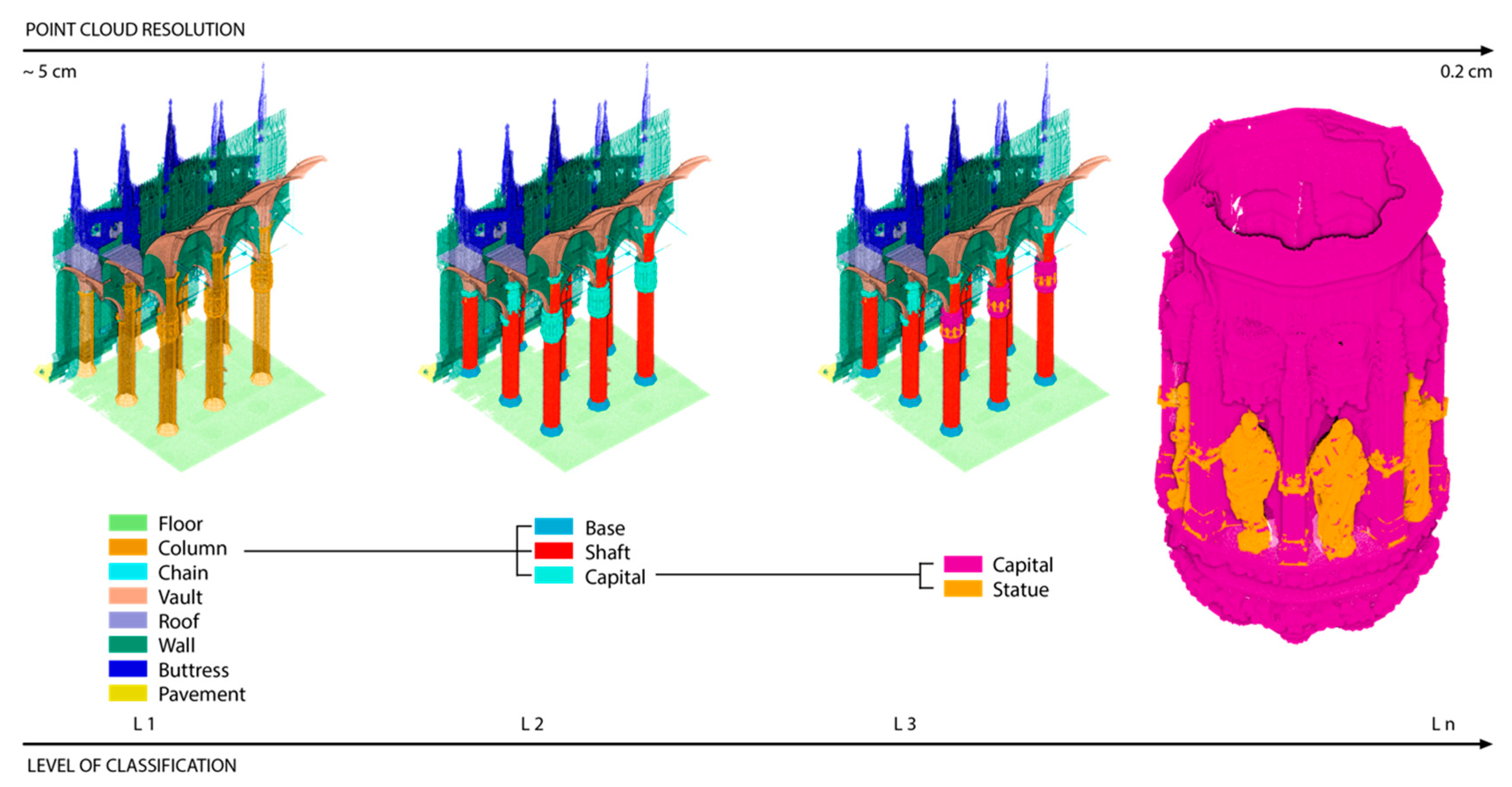 - The definition of general rules (e.g., identification of geometric features), replicable in various heritage scenarios, in terms of relations among classification levels, point cloud resolution and minimum/maximum feature search radii.