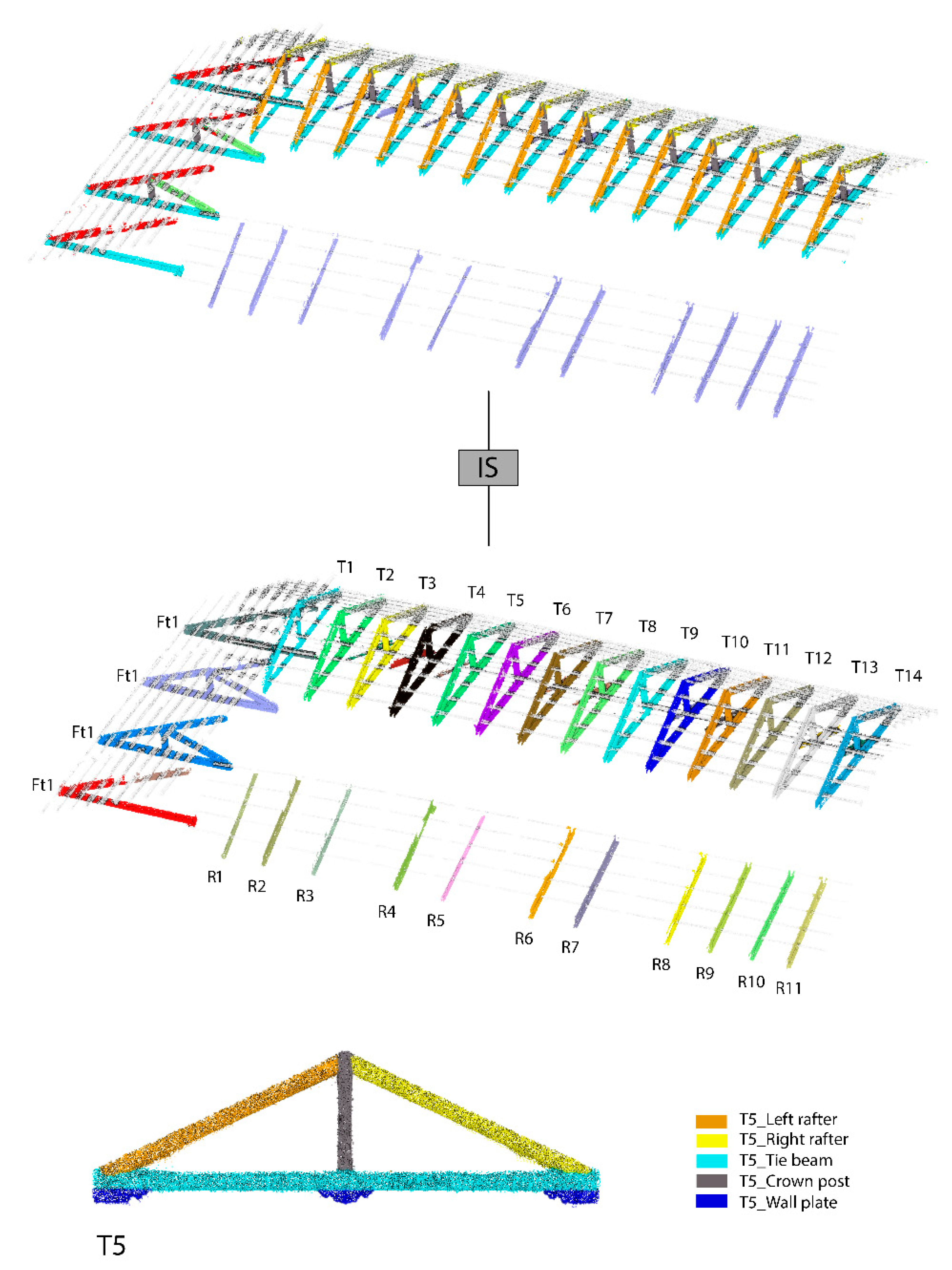 - The hierarchical segmentation (until single instances) of 3D surveying data which could facilitate HBIM processes.