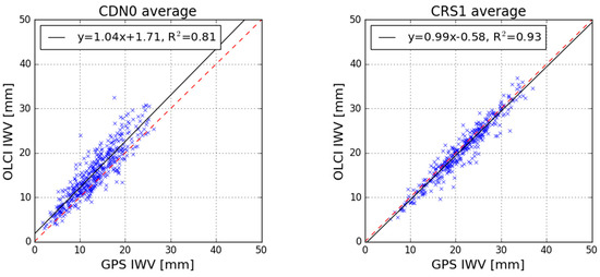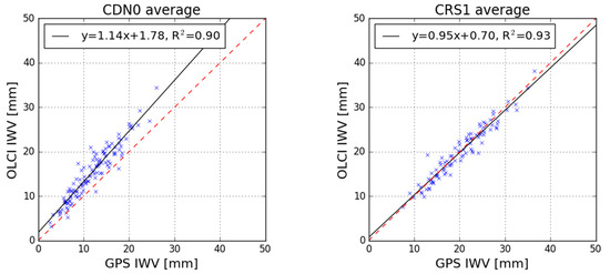 In summary, the absolute bias of OLCI(A) in integrated water vapor is closer to zero than that of the OLCI(B) [−0.57 mm for OLCI(A) versus +2.42 for OLCI(B)], but both are highly correlated with GNSS. This may be attributed to the relatively small dataset particularly for Sentinel-3B.