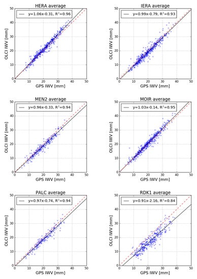 In order to investigate the existence of a correlation between the two independent techniques for the IWV estimation (OLCI and GNSS), scatterplots of Sentinel-3A OLCI and the GNSS-derived IWV values have been created for both the “single point” and “area of influence” approaches. For illustration purposes only, the “area of influence” scatterplots are shown in Figure 8. The “single point” scatterplots are given in Figure A1 in Appendix A. These figures also present a line fitted with regression on the results for each station.