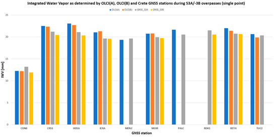 Figure 9 provides a graphical representation of the mean IWV values of OLCI(A) and OLCI(B) instruments per validation site and per OLCI retrieval approach along with the corresponding GNSS-derived IWV measurements. It can be clearly concluded that each independent technique (OLCI and GSNS processing) produces consistent results per validation site. Their difference is also, in most of the cases, similar although differentiation of the magnitude of the OLCI(A/B) absolute bias (−0.57 mm for OLCI(A) versus +2.42 mm for OLCI(B)) may be attributed to the different lengths of the available datasets.