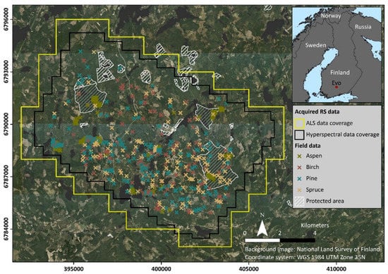 The study area (A = 83 km2) is located in the Evo area in the Hämeenlinna municipality in southern Finland (Figure 1). The area includes both managed and protected southern boreal forests [47]. The protected forests include old-growth nature reserves where endangered species are dependent on aspen and coarse woody debris exists. The main tree species are Scots pine (Pinus sylvestris L.), Norway spruce (Picea abies (L.) Karst), silver birch (Betula pendula), and downy birch (Betula pubescens L.). European aspen has a relatively sparse and scattered occurrence in the landscape (Figure 2). Agricultural land and built-up areas have a marginal cover in the region. The study area is characterized by a small-scale topographic variation, and most of the region consists of moraine and glaciofluvial deposits. The elevation of the terrain ranges between 125 and 195 m.
