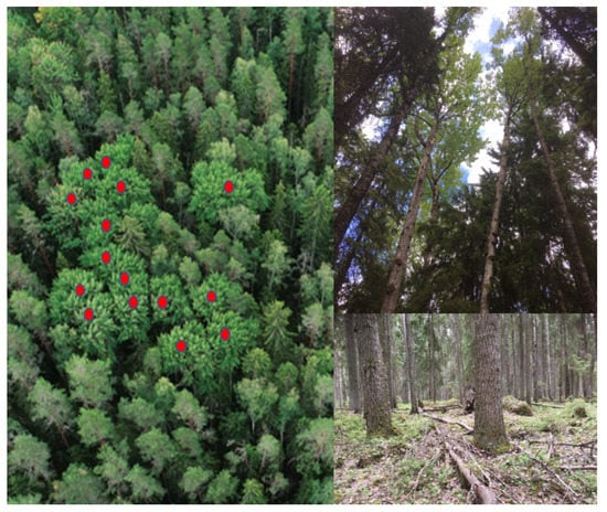 On the left, a cluster of aspens (red dots) in old growth forest of Kotinen nature protection area. On the top right, the aspen canopy. On the lower right, the forest ground layer with aspens.