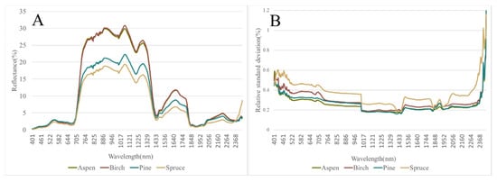 Spectral signatures of the extracted tree segments of aspen, birch pine, and spruce are presented in Figure 5. For deciduous species (aspen and birch), the mean spectral reflectance was higher compared to the coniferous species of pine and spruce, especially in the near- and shortwave infrared regions of 750–1400 and 1500–1800 nm. Within the coniferous trees, pine had a higher mean spectral reflectance along these same spectral wavelengths. Relative standard deviation was higher along the whole spectral range for spruce than the other species. For birch, the relative standard deviation was higher in the visible range than for aspen and birch.