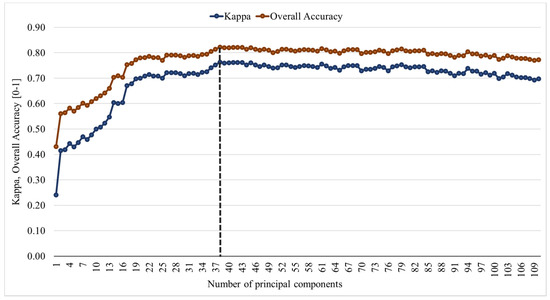 Classification results for the different principal component sets using the support vector machine. The black dashed line represents the best classification results according to OA and Kappa with 38 principal components.