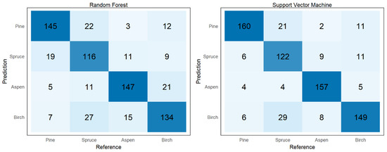 The confusion matrix of the highest OA, Kappa, and aspen F1-score for both the SVM and RF models, fitted with the combination of VI and reflectance, is presented in Figure 7. In both models, aspen is mostly mixed with birch, whereas pine and birch are mostly mixed with spruce.