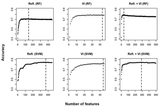 The results of the feature selection and its impact on cross-validated classification accuracy, as well as the optimal number of features leading to the best accuracy, are presented in Figure 8 and Table 5. The feature selection algorithm was successful in considerably simplifying all models except the ones trained with only vegetation indices, where two features and one feature were removed for the RF and SVM models, respectively.