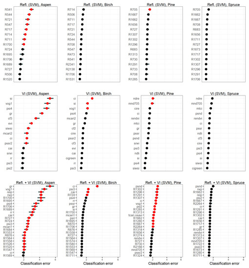 Permutation feature importance for classification of the four tree species applying the Support Vector Machine (SVM) model. The models were fitted with reflectance values (top row, 15 most important features), vegetation indices (VI) (middle row, 15 most important features), and combined reflectance values and VI (bottom row, 25 most important features). The importance is measured as the factor by which the model’s classification error increases compared to the unpermuted classifications when the feature is permuted. Each permutation was repeated 20 times. Here, the horizontal line denotes the 5% and 95% quantiles of importance values, the points denote median importance, and red color indicates that median classification error is above 2, suggesting heavy model reliance on the feature.