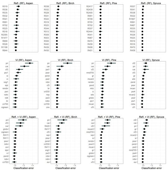 The permutation feature importance (model class reliance) plots for SVM models (Figure 9) and RF (Figure 10) revealed several interesting insights for the interpretation of the classification decisions. The F1-scores for the tree species of the SVM models were always markedly higher than those of the RF models (Table 5). Thus, it is possible to identify important features (classification error of greater than 2) from all SVM feature sets for aspen, birch, and pine, but not for spruce (Figure 9). In contrast, for the RF models, all features had a classification error of less than 1.4, and the differences between the errors were much smaller, which makes model interpretation much more difficult than for SVM (Figure 10).