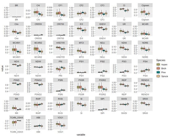 We found important common features for the discrimination of deciduous trees (aspen, birch) from coniferous trees (pine, spruce) with the SVM model. The Cellulose Absorption Index (CAI), Plant Stress Index 3 (PSI3) and red edge (724 nm) were found to be important for deciduous trees and the Pigment Sensitive Normalized Difference (PSND) was an important feature for the coniferous trees when the model was fitted with the combined reflectance values and VI (Figure 8, bottom row). Interestingly, the SVM model fitted only with VI, the most important features to discriminate between deciduous and coniferous trees differed comparing to the combined reflectance and VI (Figure 8, middle row). The Spruce Index (SI), Vogelmann Index 1 (VOG1), and Conifer Index (CI) were important for both aspen and birch in the VI model. The classification of coniferous trees benefitted from the Normalized Difference Red Edge Index (NDRE) and Modified Normalized Difference Index (MND705), although with low classification error for spruce. In addition, for the discrimination of pine, reflectance wavelength ranges in shortwave infrared (1280–1313, 1662–1667, and 2264 nm), and five other vegetation indices (PSND, CI, VOG1, Plant Stress Index 2 (PSI2), and Transformed Chlorophyll Ratio Index/Optimization of Soil-adjusted Vegetation Index (TCARI/OSAVI)) were important (Figure 9, bottom row).