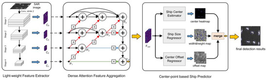 The rest of the paper is arranged as follows: Section 2 introduces our proposed method in detail, which mainly includes the lightweight feature extractor, dense attention feature aggregation and center-point ship predictor. The experimental results on the AirSARShip-1.0 data set are given in Section 3 to quantitatively and qualitatively evaluate the effectiveness of our method. In Section 4, we discuss the influence of the network’s width on the detection performance and further validate the components’ effectiveness. Section 5 gives the conclusion.