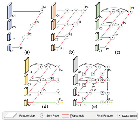 Figure 2a shows a classic feature fusion structure [46], namely long skip connections (LSC). Among the multiscale features {C1, C2, C3, C4} by the feature extractor, C1 is the smallest but with richest semantic information. LSC gradually upsamples C1, and fuses it with the other three features, C2, C3 and C4, through long skip connections. This process can be described as follows: