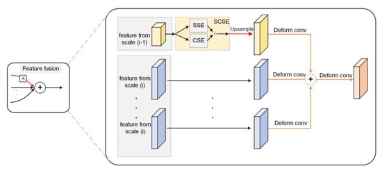 Inspired by the ideas, we introduce an attention block, namely the spatial and channel squeeze and exception block (SCSE) [50] into the feature fusion block. In the multiscale feature fusion process, the high-level features contain stronger semantic information thus have a greater influence on the identification and the localization of the ship targets. SCSE is applied to improve the representation ability of the fused features by strengthening the salient features and suppressing the background clutters in the high-level and strong semantic features. The new feature fusion block embedded with SCSE is called the attention-based feature fusion block (AFFB). In addition, the deformable convolution is used in AFFB to replace the standard 3 × 3 convolution. The deformable convolution learns the sampling offsets to enforce it to focus more on the interesting targets. In the object detection task, it has been proved to be effective in improving the localization ability of the network [37,51]. The structure of AFFB is shown in Figure 3. Features from the higher-level are first processed by SCSE, then upsampled to the same resolution as other features. Next, these features are fused through element-wise addition after the deformative convolutions. Finally, a convolution layer is used to refine the fused features.