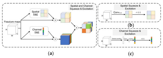 The overall diagram and the detailed illustration of SCSE. (a) Diagram of SCSE; (b) detailed structure of spatial squeeze and excitation (SSE); (c) detailed structure of channel squeeze and excitation (CSE).