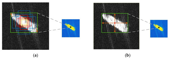Among the classic DCNN-based detection algorithms, most of them rely on the pre-set anchors of different sizes and aspect ratios for detection. The concept of anchors (or anchor boxes) in the field of DCNN-based target detection is firstly presented in [21]. In the anchor-based detection methods, the targets are detected by predicting the errors between the pre-set anchors and the actual bounding boxes, as shown in Figure 5a. Some disadvantages exist in this kind of detection methods, such as the difficulty in their adaptability to large scale-variations of the targets, the difficulty of the parameter optimization of anchors and high computational costs. Therefore, an anchor-free detector is introduced in our method, which is the center-point-based ship predictor (CSP). As shown in Figure 5b, CSP achieves anchor-free ship detection by simultaneously predicting the center-points and the sizes of the ship targets in a fully convolutional way. Moreover, by applying a 3 × 3 Max-pooling operation, the duplicate detections can be ruled out, which is more efficient than the NMS algorithm.