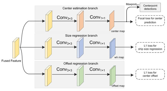 The detailed structure of CSP is shown in Figure 6. It is composed of three sub-branches: the center estimation, the size regression and the offset regression branches. The input SAR image is first processed by the feature extractor and DAFA. Then high-resolution features by DAFA are fed towards these three branches, where and . After the operations of a convolution and an convolution, the ship center estimation branch produces the ship center estimation heatmap that indicates the locations of the ship centers; the size regression branch outputs the ship width and length prediction maps that predict the width and length of ship targets; and the offset regression branch generates the offset prediction maps , which compensate the downsampling errors in the x- and y-axis.