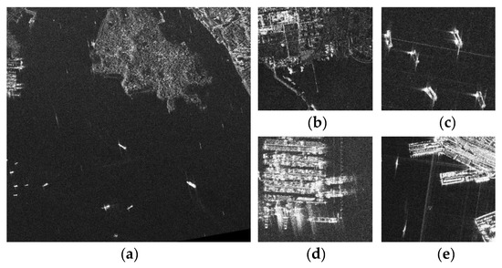 Several synthetic aperture radar (SAR) images from the AirSARShip-1.0 data set. (a) Example of the large-scene SAR image; (b–e) some SAR image slices cut from large-scene SAR images.
