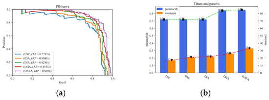 The PR curves are illustrated in Figure 8a to comprehensively show the effectiveness of these aggregation schemes. It is shown that the PR curve of LSC lies at the innermost, indicating that its detection performance is the worst. The PR curve of IDA shows improvement, proving that the iterative connections can produce finer features than long skip connections. The PR curve of DIA lies lower than that of IDA, demonstrating that dense connections can help achieve better performance by feature reuse strategy. The PR curve of DHA lies lower than that of DIA, showing that the high-resolution feature fusion path is able to optimize the detection performance by fusing features with larger receptive fields and stronger semantic information. The PR curve of DAFA is at the highest, which suggests that the attention mechanism can effectively strengthen the localization accuracy and semantic meaning in the high-level features, and thus improve the representation ability of the fused features.