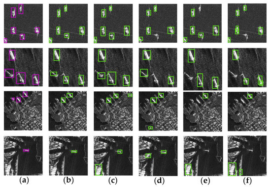 In Figure 9, we visualize the detection results on several SAR image slices for comparison. Figure 9a shows the ground truth, in which the real ship targets are marked with purple rectangles. Figure 9b–f shows the detection results of DAFA, DHA, DIA, IDA and LSC, in which the detected ship targets are marked with green rectangles. The false alarms and missed targets can be located with the reference of Figure 9a. As shown in Figure 9f, the detection results of LSC are the worst among these methods. There are more false alarms and missed ship targets in both inshore and offshore scenes. IDA also has some false alarms and missed targets in different scenes according to Figure 9e. Compared with these two methods, DIA in Figure 9d has less missed targets in the inshore scene. DHA further improves the detection results compared to DIA. The missed targets in the offshore scene are reduced. The comparison of the above detection results demonstrates that dense connections and iterative feature fusions can effectively improve the localization ability of the network for a variety of scenes. The high-resolution feature fusion process further optimizes the detection results by combining multiscale semantic information. In Figure 9b, it can be seen from the results of DAFA that the false alarms in the land area further reduce. It indicates that SCSE is able to suppress the background clutters in the high-level features, optimize the feature fusion process and improve the detection performance.