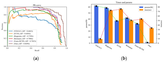 The comparison of different feature aggregation schemes. (a) Comparison of the precision–recall (PR) curves; (b) comparison of the number of parameters and the average detection time.
