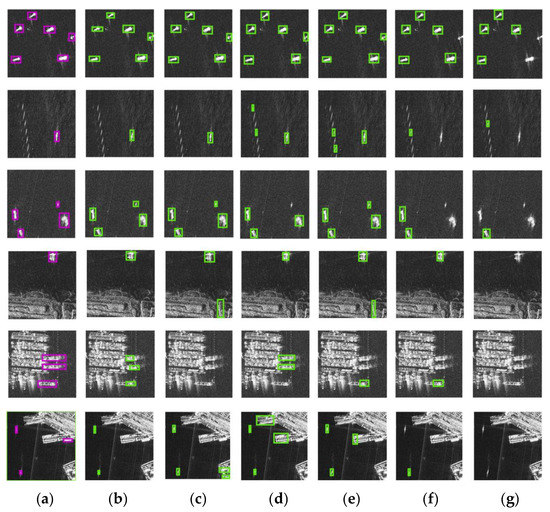 In Figure 11, detection results on several SAR image slices qualitatively show the performance of these methods. Figure 11a gives the ground truth and Figure 11b–g shows the results of our method, RetinaNet, Faster-RCNN, Reppoints, FCOS and YOLOv3, respectively. Image slices in the first three rows are composed of offshore scenes, and the latter three include the inshore scenes. In Figure 11g, a lot of missed detections occur in both inshore and offshore scenes of the YOLOv3′s detection results. In Figure 11f, the missed detections are reduced in the results of FCOS, but still, many ship targets remain undetected. The results of FCOS in Figure 11e show few missed detections in the offshore scene, but false alarms appear in some land areas due to the land clutter. In Figure 11d, Faster-RCNN mistakenly detects the weakly-scattered ghost targets on the sea surface as ship targets in the second image, a small ship target is undetectable in the third image and false alarms appear in the land areas. In Figure 11c, RetinaNet is prone to generate false alarms and missed detections in the strong scattering area, resulting in inaccurate detection results. In Figure 11b, the results of our method are more accurate than other methods, with few false alarms and missed detections in both inshore and offshore scenes. Therefore, the results demonstrate that our method has superior detection performance than other comparison methods.