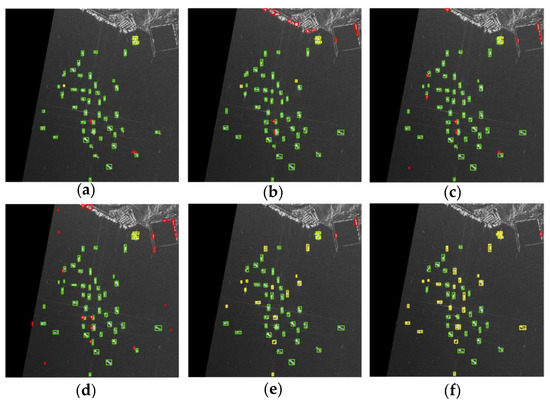 Detection results of different methods on a large-scene SAR image. (a) Our method; (b) Faster-RCNN; (c) RetinaNet; (d) Reppoints; (e) FCOS; (f) YOLOv3. The green rectangles mark the correctly detected ship targets, the yellow rectangles mark the missed detections and the red rectangles mark the false alarms.
