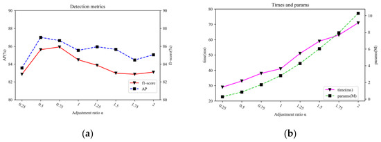 The influence of the network’s width on performance, the number of parameters and the detection speed of the network. (a) Influence of the network’s width on the detection performance of the network; (b) influence of the network’s width on the number of parameters and the detection speed of the network.