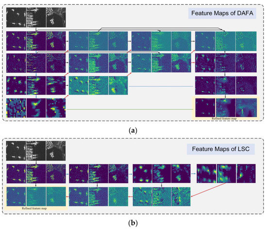 Feature map visualization results of DAFA and LSC. (a) Visualization results of the feature maps in DAFA; (b) visualization results of the feature maps in LSC for comparison. The blue arrows denote the downsampling process. The red, blue and green arrows denote the upsampling process in DAFA.
