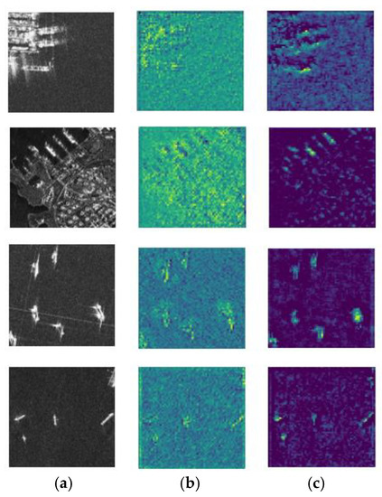 To visually verify the effectiveness of the SCSE, some feature maps are visualized in Figure 15. Figure 15b shows the feature maps before processed by SCSE, and Figure 15c shows the feature maps output by SCSE. In the visualization results, the brighter colors denote greater activation values. By comparing Figure 15b,c, we can observe that the contrast between targets and the background is improved, and the position responses of the targets are more accurate. In the inshore scenes, we can see that the land clutters are effectively suppressed after SCSE. The above results indicate that SCSE can effectively enhance the salient features of the targets and suppress the background clutters.