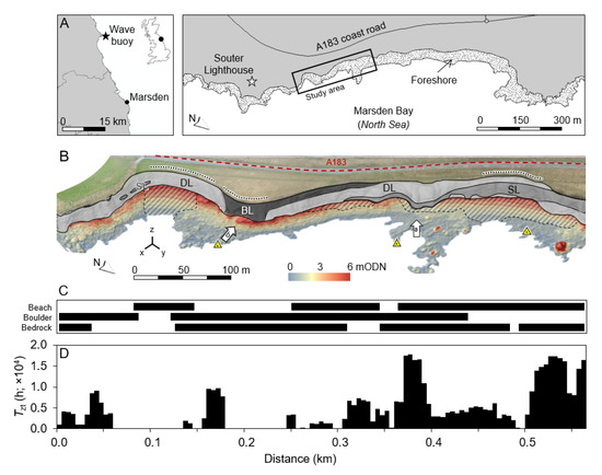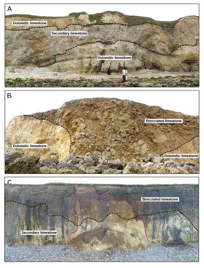 Marsden Bay extends for ~1.5 km along the coastline of northeast England. Its orientation exposes it to fetch distances that exceed 1900 km. Tides range to 5.6 m and the mean and maximum recorded wave height during our monitoring period at the Newbiggin wave buoy, 25 km north of the study site, were 0.9 and 9.8 m, respectively. We focused on a 0.6 km sub-section of the wider bay that includes alternating embayment and headland relief, sub-vertical coastal cliffs with sporadic deep-cut caves, discontinuous sections of uneven shore platform and boulder fields, and pockets of dry pebble and sand beach (Figure 1). The uncertainty surrounding the true rates and responses of the coastal cliffs at three key pinch points has raised concerns over the safe operation of a cliff top coastal road, the A183 that links South Shields to Sunderland [25]. The cliff face is ~25 m in height and is composed of a complex assemblage of dolomitic limestone and dedolomitized limestone. The latter has transformed from limestone to dolomite, and back to limestone via dedolomitization, or re-calcification; we term this lithology ‘secondary limestone.’ Additionally present are concretionary brecciated limestones, formed ca. 252–272 Ma (Figure 2). Dissolution weathering and karstic collapse are evident, resulting in a variety of structural forms ranging from intact to brecciated material, and generally of weak to extremely weak geotechnical competence, which is noted in local borehole inspection reports that could not recover sufficient intact material for strength testing. Dip angles are 41°, 29°, and 47° for the dolomitic, secondary, and brecciated limestones, respectively. Bedding thickness varies between 0.3 and 3 m and is largely horizontal along the cliff face. Joints and fractures tend to be vertical in the dolomitic and secondary limestones but are chaotic in the brecciated limestone. Texturally, the dolomitic limestone is quite open with numerous cavities, rendering it theoretically less competent and prone to weathering than the denser secondary limestone, which, due to its recrystallized nature, possess fewer cavities. Many, but not all, of the brecciated areas are held together with a crystalline cement matrix that adds some cohesion despite the presence of numerous cavities. Further information on the geological context of the site is provided by Smith et al. [33] and Cooper et al. [34]. Contemporary rates of cliff top recession are within manual cliff line survey error, which, in places, can approach or exceed 3 m [35,36]. The predicted future retreat rate of the wider stretch of coastline is 0.1–0.2 m a−1 [34].
