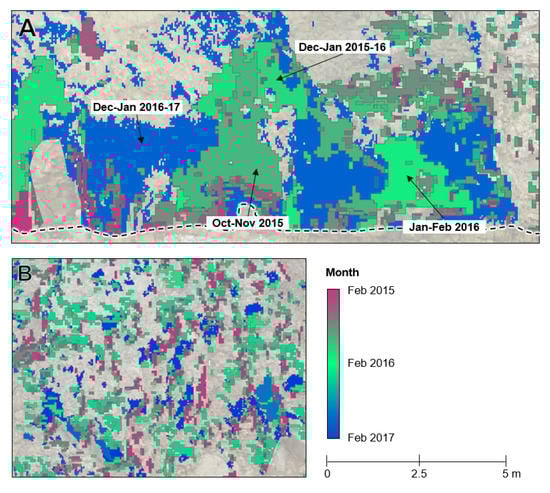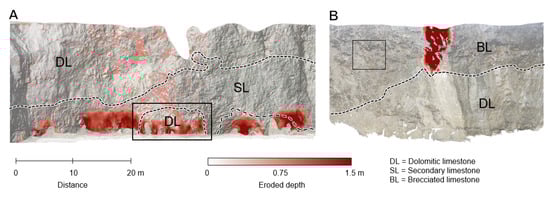 Example erosion depth maps for individual differencing periods retrieved from digital elevation model (DEM) differencing. (A): Extensive erosion of existing caves at the cliff base between December 2016 and January 2017, beginning at a cliff line distance of 0.38 km (see Figure 1). Erosion extends across both dolomitic and secondary limestones. (B): The largest cliff-top failure recorded during the monitoring period, which occurred in the period of March–May 2016 at a cliff line distance of 0.34 km. In this example, the erosion scar is confined to the brecciated limestone and does not extend down into the dolomitic limestone. Background data are a semi-transparent RGB orthoimage, draped over a hill-shaded DEM. Dashed lines show lithologic boundaries. Square boxes in A and B show locations of Figure 9A,B, respectively.