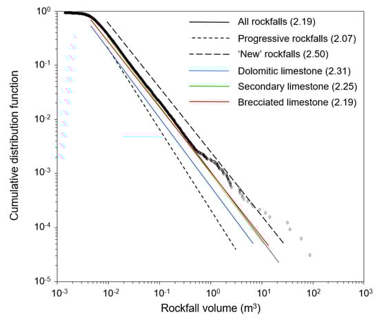 Cumulative distribution functions (CDF) and associated power law functions for the entire rockfall inventory, progressive and ‘new’ rockfalls, and specific lithologies. Scaling exponents for each inventory are displayed in brackets. CDFs were derived and plotted using the ‘poweRlaw’ toolbox for R (https://cran.r-project.org/web/packages/poweRlaw/index.html).