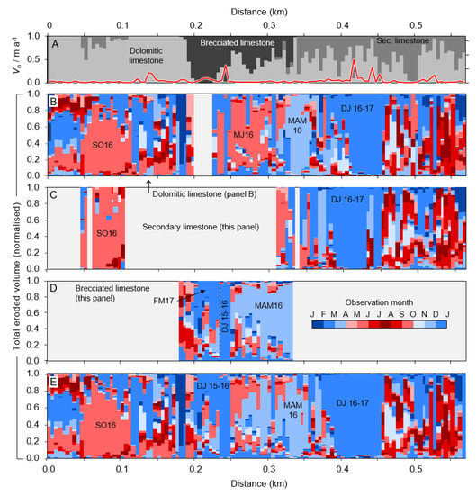 Cross-shore, lithology-specific spatiotemporal erosion cycling. (A): Percentage of total erosion attributable to each cliff geology (Vn) for 5 m cliff line bins. Red line is annual erosion rate (m a−1). (B–E): Combined spatial and temporal distribution of rockfall activity for all lithologies (B) and the dolomitic, secondary, and brecciated limestones, respectively (C–E). Vertical axis is normalized eroded volume per 5 m cliffline bin. Text annotation highlights notable periods of activity (i.e., SO16 = September–October 2016). Red-blue color ramp in (B–E) relate to the time of year. Broadly speaking, blues and reds equate to ‘winter’ and ‘summer’ erosion, respectively.