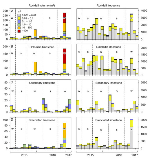 Lithology-specific periodic rockfall volume (column 1) and rockfall count (column 2) contributions. (A): All lithologies; (B): Dolomitic limestone; (C) Secondary limestone; (D): Brecciated limestone. ‘w’ and ‘s’ denote ‘winter’ and ‘summer’ periods, respectively. The key in panel A applies to all panels. Note the y-axis limits for column 1 vary for each panel.