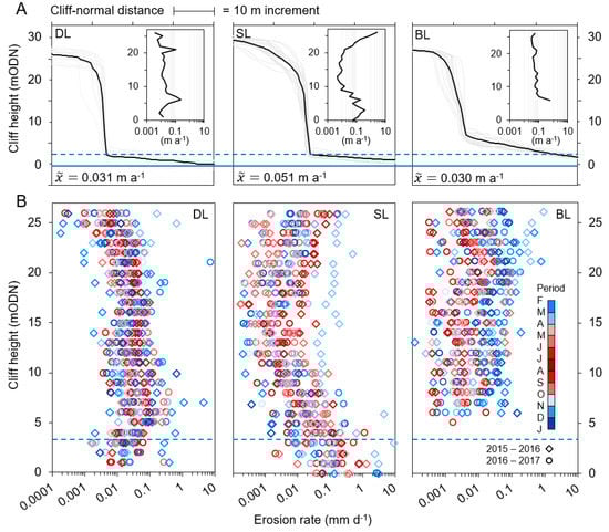 (A): Lithology-specific cliff-normal topographic profiles. Grey lines are individual profiles, extracted every 5 m of cliff line distance for representative sections of each unit. Black line shows mean profile. = mean erosion rate per lithology. Solid and dashed blue lines indicate position of mean sea level and the highest astronomical tide, respectively. Inset panels show mean erosion rate (x-axis for all = m a−1) according to cliff height (y-axis; mODN). DL, SL, and BL are dolomitic, secondary, and brecciated limestone, respectively. (B): Temporal distribution of erosion rates across the cliff height. Data are classified by lithology and by differencing period for 1 m cliff height bins.