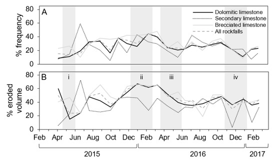 Progressive rockfall contributions in different lithologies, reflected as relative percentage of (A): Rockfall frequency, and (B): Eroded volume for successive differencing periods. Grey shading and i–iv annotation highlight periods that include notable storm events and can be cross-referenced to Figure 11. Data were de-trended to remove the effect of decreasing ‘fresh’ surface area through time, an effect that produced a residual positive linear trend in both relative progressive rockfall (PRF) frequency and eroded volume through time, upon which monthly variations were superimposed.