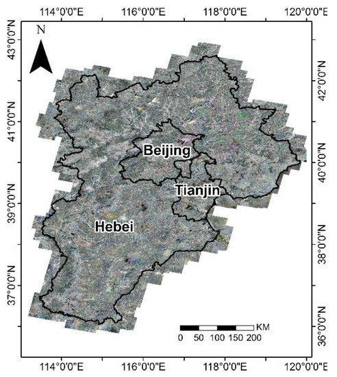 The geographic location of the Jing–Jin–Ji region, China. The underlying image is mosaiced GF-1 satellite imagery.