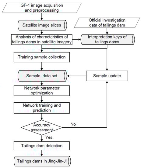 The proposed target detection consisted of five main steps (Figure 2): data preprocess, identifying characteristics of tailings ponds in satellite imagery; preparing samples for use as training and testing sets for the SSD network; training and optimizing the SSD network parameters; and assessing the accuracy of SSD network and detecting tailings ponds in the Jing–Jin–Ji region.