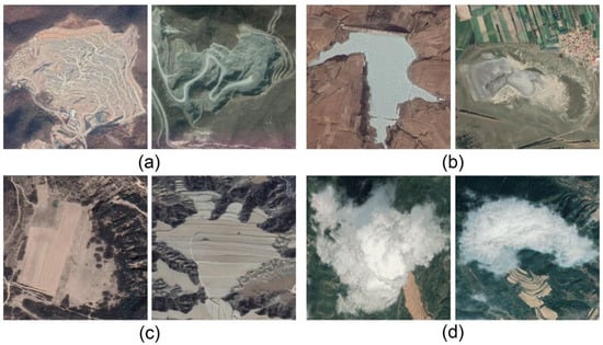 - Negative samples related to mining activities. This kind of object mainly includes mining pit, mining field, waste rock dump, and so on. Since their hue, texture, and shape are similar to those of tailings ponds, they are often mistakenly detected.