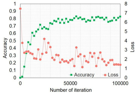 Figure 7 illustrates the loss and accuracy curves that were found for 100,000 iterations of the SSD model. The loss curve quickly decreases to below 0.4 and remains stable up to about 100,000 iterations, which indicates that the network efficiently learned the data. An accuracy of 84.5% was achieved at the same time.