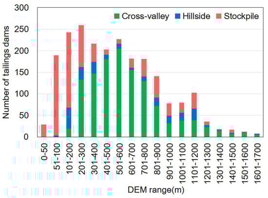Distribution of cross-valley, hillside, and stockpile tailings dams in areas with different elevations.